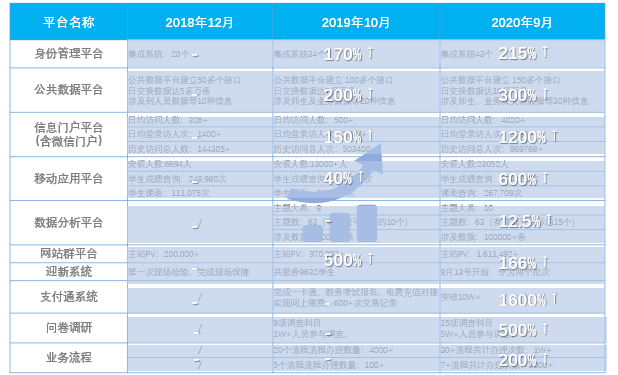 一是学校重视基础支撑平台和业务构建平台等工具,面向校内各角色梳理并建立各类业务服务。利用成熟的技术实现部署、开发、运维、集成等多纬度模式创新。并通过基础平台的使用及数量积累来进行建设效果的检验,从而取得不俗的实用成果。