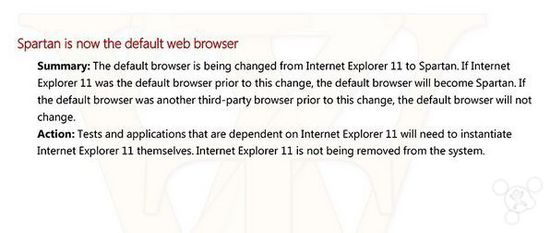 在泄露的 Windows 10 Build 10056 说明文档中,微软详细说明了 Spartan 成为系统默认浏览器的一些条件。微软表示,对于正在使用 Internet Explorer 作为默认浏览器的 Windows 10,Spartan 将取代其位置,打开链接时浏览器的主窗体为 Spartan。另一方面,如果默认浏览器是第三方浏览器,如 Firefox 或 Chrome,新升级不会改变任何设置,无论是 Internet Explorer 还是 Spartan 都是第二选择。