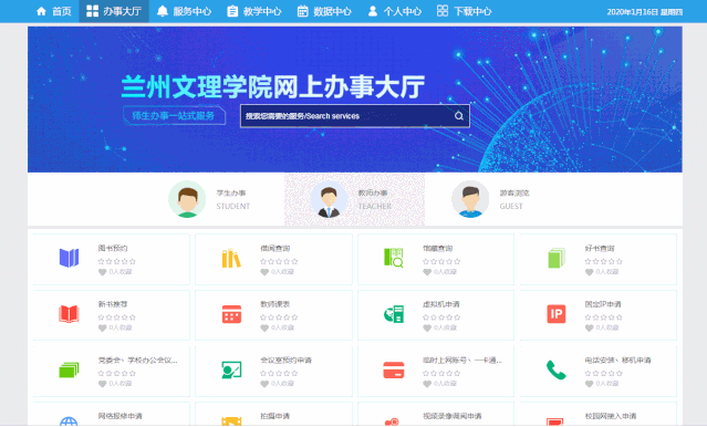 ◆ 分角色、“智能化”的服务供给(学生办事、教师办事、游客浏览),辅之以一框式服务搜索,最大限度节省师生服务查找的时间成本;