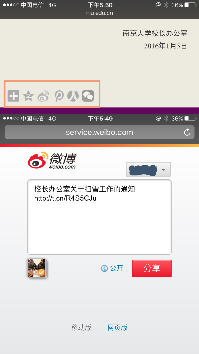 在利用手机浏览主站时,遇到有趣或者重要新闻、信息都可以一键分享到微信、QQ空间、微博和人人。