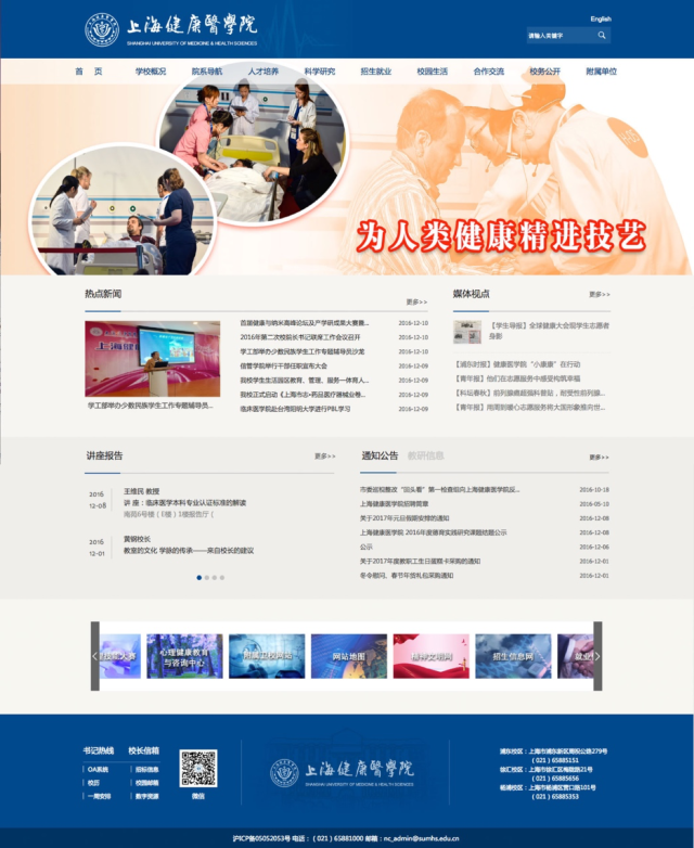 上海健康医学院是一所新建的市属本科医学院校,其网站群系统对宣传和服务进行了双重定位,主页简洁大气,凸显医学元素,注重用户体验。部门、学院以及专题网站等38个站点,和党建网、信息公开、精神文明网系统一起,形成了技术标准统一、形象统一、管理统一的宣传体系,致力于服务师生,并合力展现学校在人才培养、科学研究、社会服务、文化传承创新、国际交流合作方面的特色。