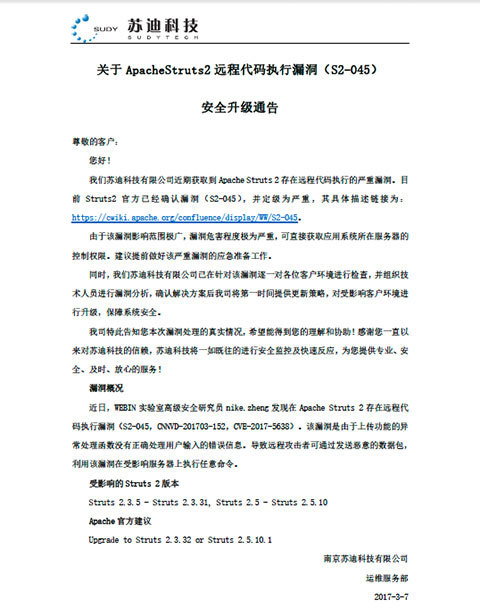 特别提醒您及时检查在使用的所有系统是否受Struts2 S2-045漏洞影响。如需苏迪协助,请和我们联系,我们将尽力协助您完成安全加固。