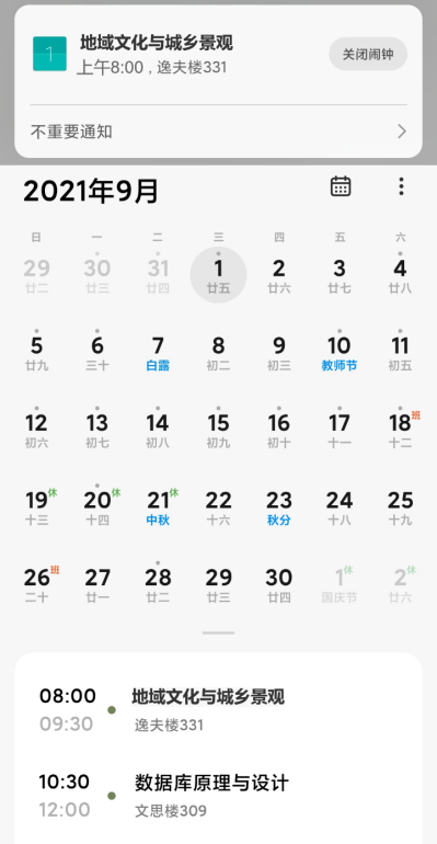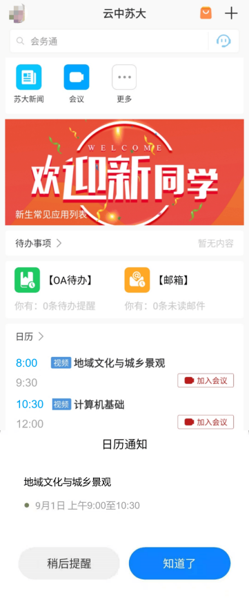 小苏的日历发来闹钟提醒,“叮”~30分钟后的课程不要迟到哦!“云中苏大APP”将日程同步到手机日历,一天之际在于晨,一日之际在于“程”!勤劳小苏向教学楼出发!