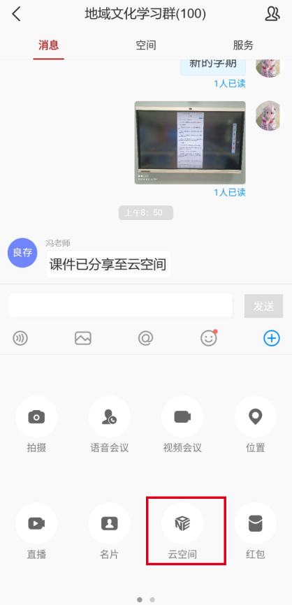 课间休息打开讨论组,冯老师已将学习资料上传至云空间,文件资料实时共享 。