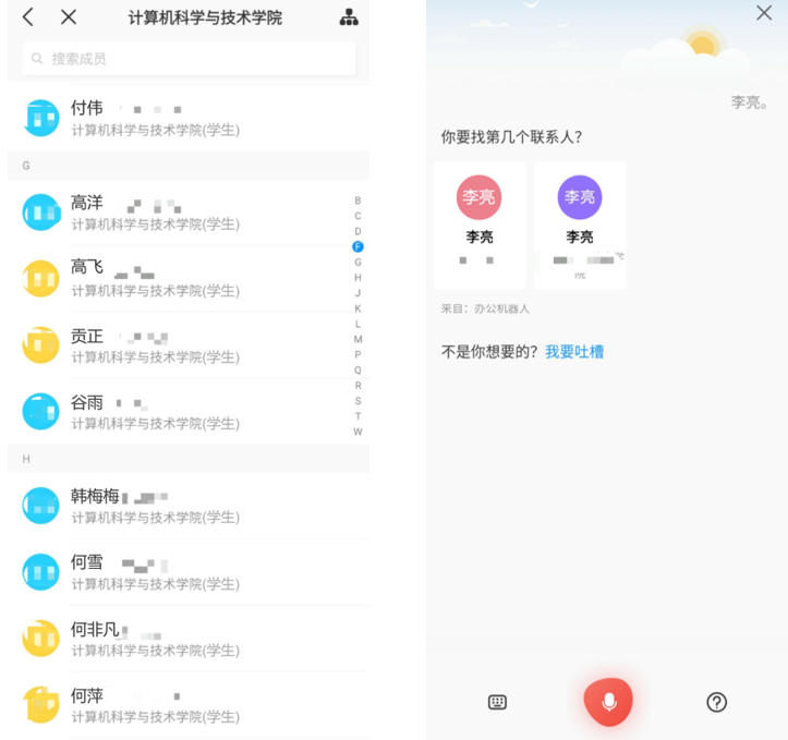 某学生社团组织第一次线下活动,组织者发现缺席几人,迅速打开“云中苏大APP“通讯录,首字母检索即时取得联系,时间紧急喊小微来帮忙,找人更迅速!