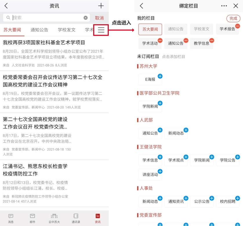 闲暇时分,小苏打开“云中苏大APP”的校园资讯,浏览学校、学院、学生处、教务处等新闻,掌上苏大尽在指尖。意外发现自由订阅功能,感兴趣的栏目触手可得。
