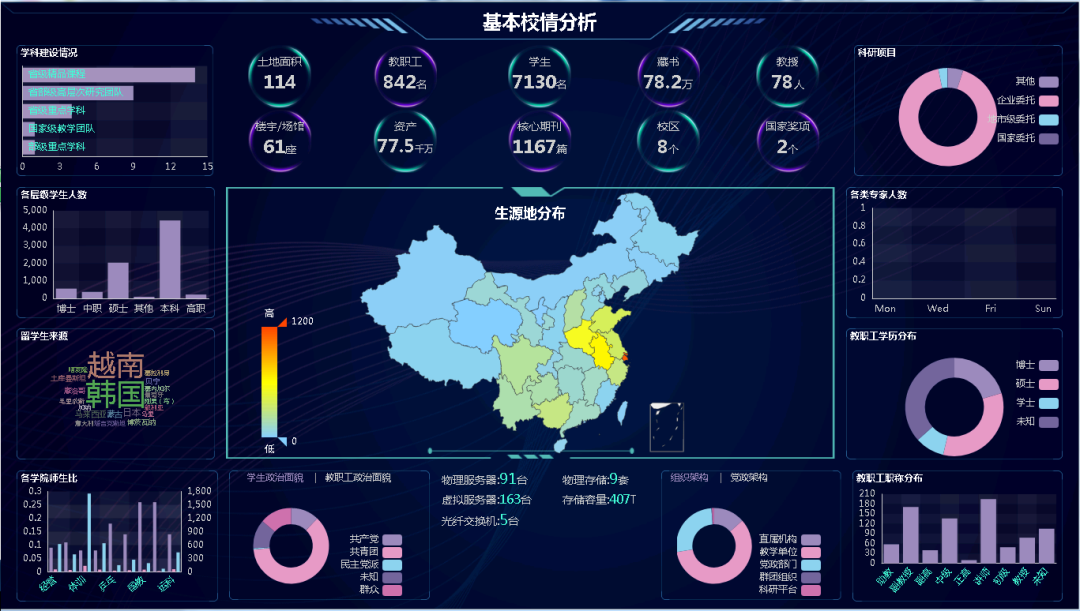 随着数据集中与集成工作的推进,及近年来大数据项目在各高校中的建设,通过技术手段进行数据集中,利用数据分析促进数据治理。用数据驱动业务,对校内业务数据进行可视化设计,以达到提升校内管理水平和应用水平目的。