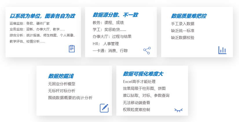 校级统筹因数据壁垒难以深入业务,无法高效响应数据分析需求,如:历史分析、汇总分析、多维分析等。这影响了管理信息化智能化的进程。