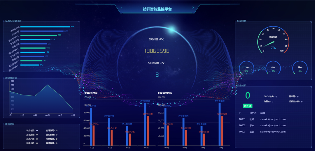 作为智能监控体系中的“管理员驾驶舱”做到了全局通览,同时,将站点发布量排行、信息发布量统计、建设情况、访问统计、月度最热网站/栏目统计等数据进行展示。