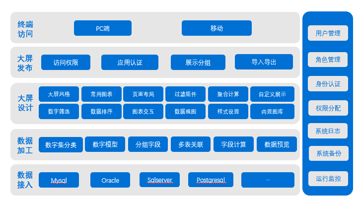 传统的各业务系统建设或多或少都有各自的数据分析与展示后台,由于系统之间的壁垒,数据无法实时共享,导致数据的分析展示作用、查看权限受限。