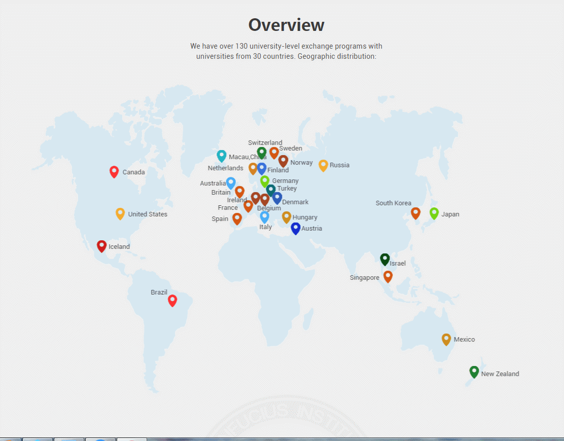 采用世界地图的展现方式列出校级层面的交换项目,新颖别致,国家、院校、地理位置信息呈现清晰有条理。