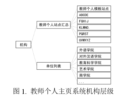 在传统网站群系统中,机构是将站点进行分类别和分层级归纳的各个节点,如基于华东师范大学门户网站的网站群系统的一级机构为“门户网站群”、“党务公开网站群”、“信息公开网站群”,在“门户网站群”之下又包含“教学院系”、“党群组织”、“行政机构”、“科研机构”等二级机构,站点一旦在这些机构目录中确定下来后,一般很少再更换所在目录。而在教师个人主页系统中,为了确保教师站点的灵活性,一级机构主要包括两类:“教师个人站点汇总”与“单位列表”,如图1所示。其中,前者是所有教师个人主页站点的母机构,教师的个人站点都被创建在该机构中;而后者则是对教师进行部门划分的母机构。