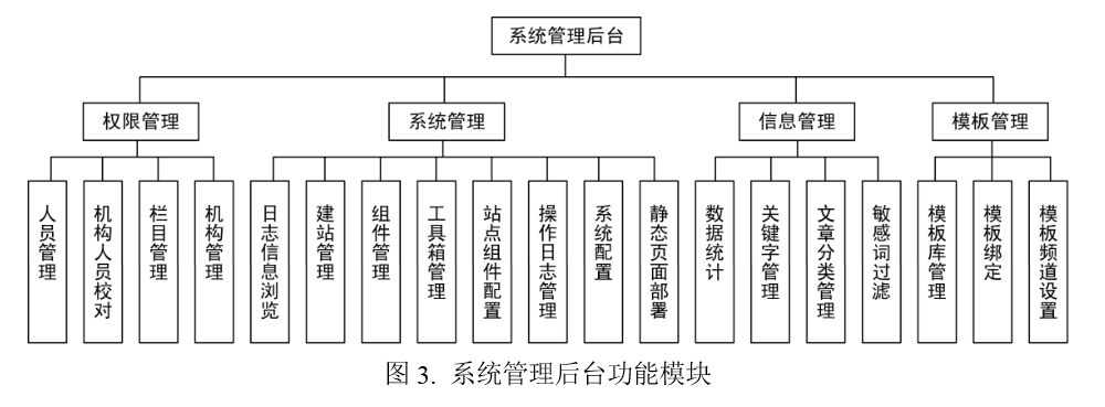 管理后台是供教师和系统管理员进行内容和权限等管理操作的平台。后台账户与华东师范大学统一身份验证相结合,用户使用工号和公共数据库密码登录系统。在系统管理员的管理后台中,主要有权限管理、系统管理、信息管理、模板管理四类功能,如图3所示。其中,权限管理用于构建系统机构目录,在各目录下添加教师账户,并进行相应的人员和权限管理。系统管理主要用于浏览日志信息、管理组件、配置站点、管理操作日志、部署静态页面、配置系统参数等,其另外一个重要功能是按账户创建教师站点并对所有站点进行管理。信息管理用于统计信息数据,并对文章分类、关键字、敏感词过滤等设置全局参数;此外,高权限的系统管理员也可以对所有次级站点的教师信息进行管理。模板管理用于管理所有的模板站点及其模板套。