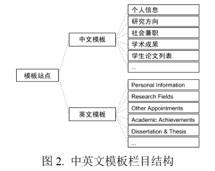 如前所述,教师个人主页系统通过模板站点实现全局性统一,模板站点决定了整个主页系统的内容呈现。在模板站点中,主要确定了站点的栏目结构、语言页面和界面风格。