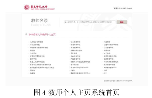 教师个人主页系统需要一张主页面作为所有站点的索引页,在该页面中提供了两种方式供浏览者查询教师信息。一种方式是使用搜索框。传统的教师个人主页搜索仅仅搜索教师姓名,所实现的效果有限。为了使主页系统成为高校学术交流的重要工具,我们扩大了搜索的字段范围。用户在搜索框中可以输入教师的姓名、研究方向、专业学科等中英文关键字来寻找相应教师。另一种方式是使用列表。主页面提供了院系列表,浏览者逐层深入其中,查看各个部门下的教师名单。该方式适合于对查询教师对象较为熟悉的浏览者,并有助于浏览者全面了解某院系的师资力量。所有的查询页面都含有中英文链接,以方便浏览者在不同语言版本间切换。在页面中还部署了GoogleAnalytics的访问统计代码,记录各页面的访问数据和用户交互行为,以便通过搜索标签的热门程度深入挖掘当前学术研究热点。最终发布运行的系统首页如图4所示。