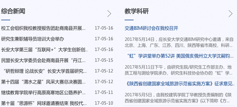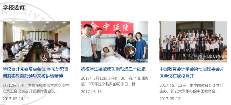 长安大学新主页充分考虑浏览者阅读习惯和需求,创新地融合新媒体,栏目清晰,内容丰富,设计新颖,凸显长安大学特色。