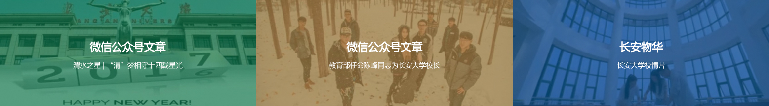 长安大学在主页中间区域的新媒体文章直接引入了微信公众号的文章,增加了视频宣传片,内容更加多元化,有声有色展示学校网络文化宣传成果。