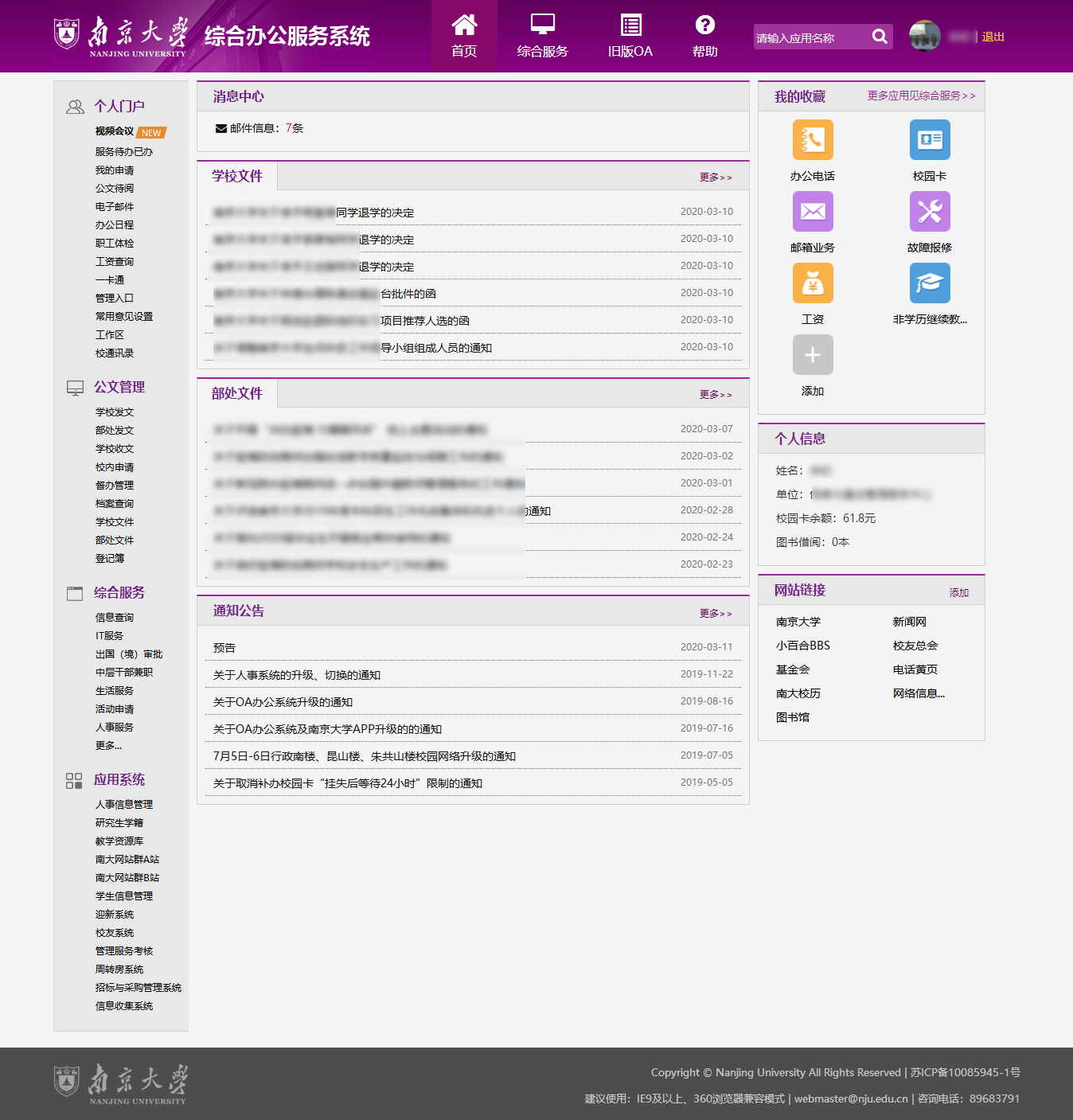 南京大学综合办公服务系统是一个“统一入口、统一办公、统一事务、统一消息、统一搜索”的多终端办公服务平台。提供完善的业务流程管理解决方案,建立全校业务流程实现技术标准和规范,构建包括OA、信息查询、IT服务、生活服务等应用,实现教师业务的跨部门、跨业务流程的统一建模、监控和优化,并与已建统一身份认证平台、数据平台实现集成,为用户提供PC端和移动APP端一致的一站式办事服务体验。