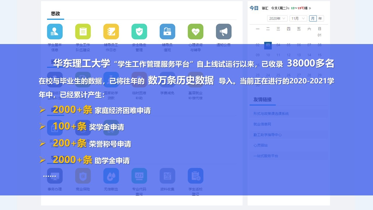 每一学年的资助工作开展、每一次的奖学金与荣誉称号申请、每一位情绪异常的同学、每一天的院系未读消息……这些涉及到师生在校生活的方方面面,都可以在统一环境下,得到最优的解决途径。