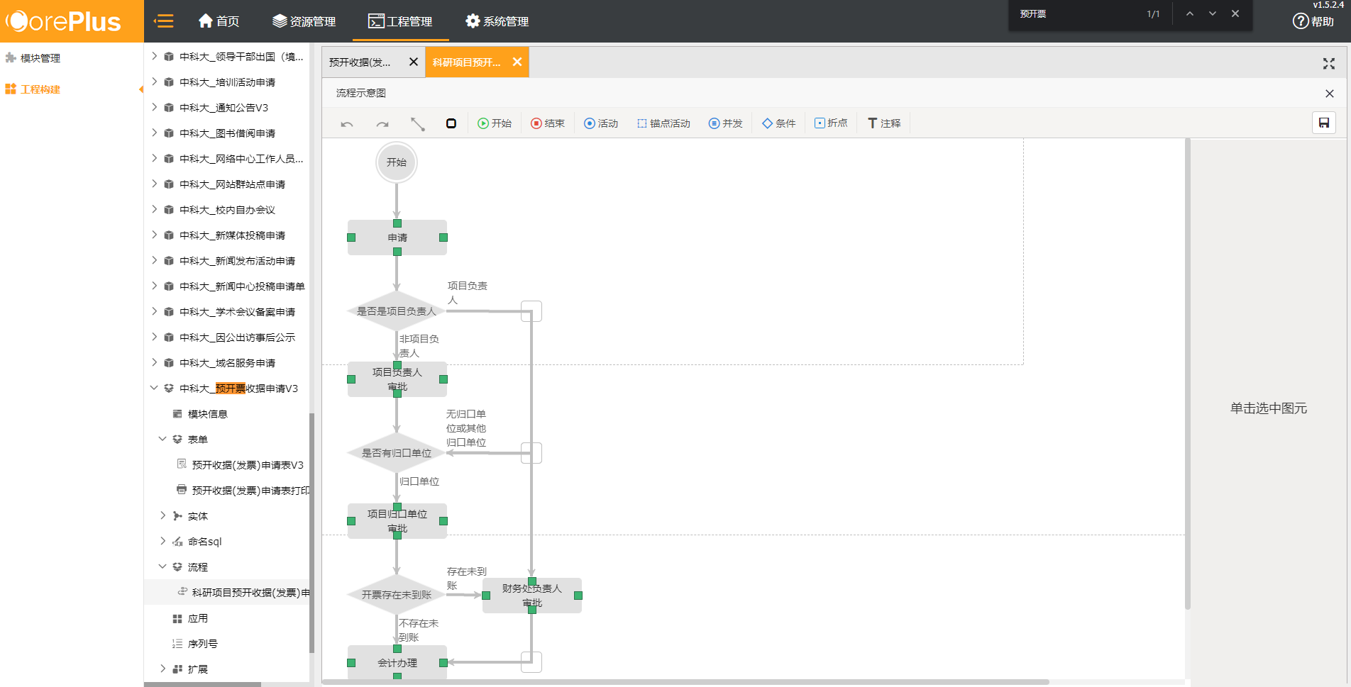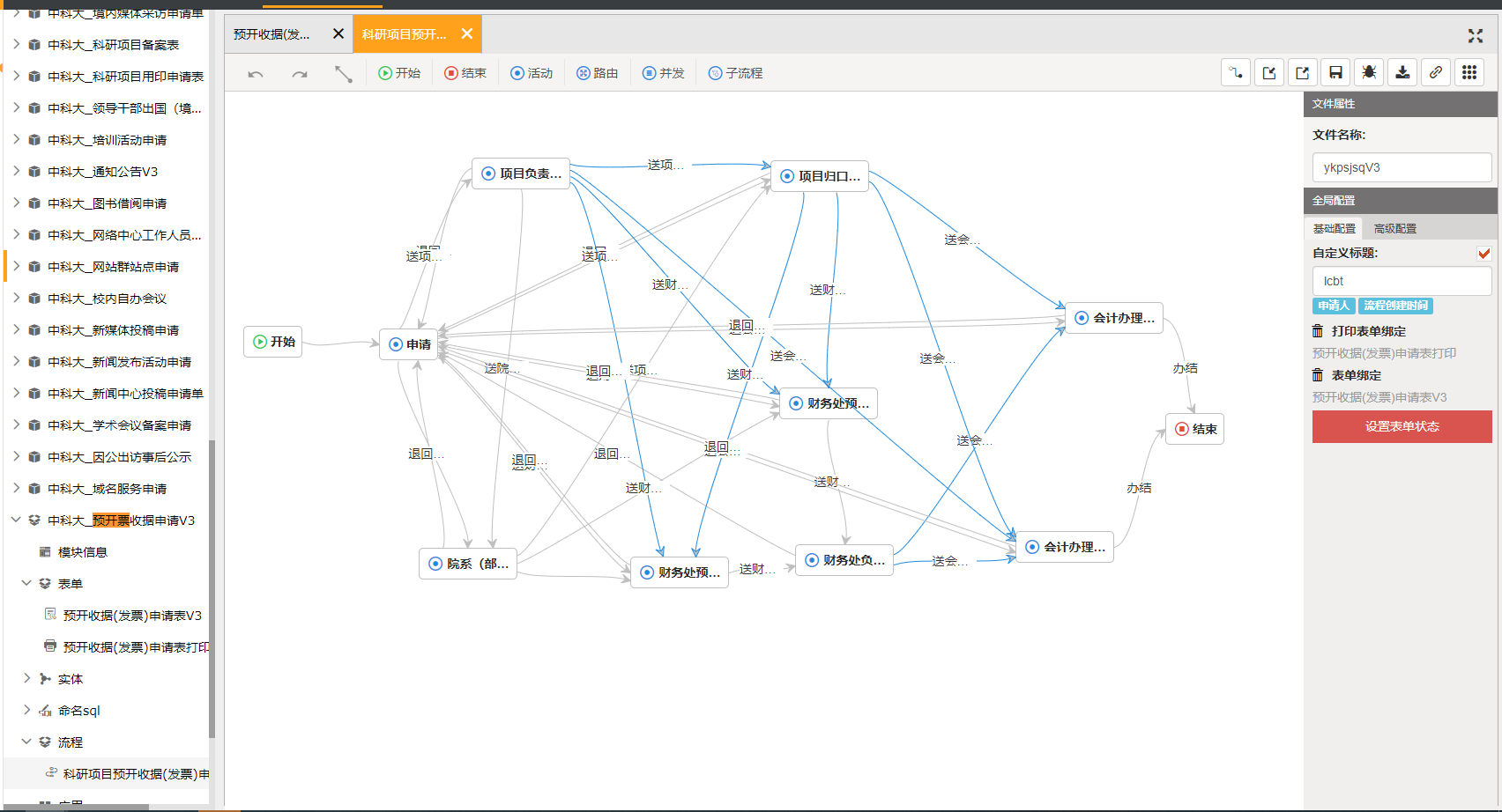 以预开收据(发票)申请表为例,通过上图中的导航栏,可以快速进行业务表单的拖拽式开发工作。